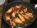 Die Flügel werden in genügend Öl bei mittlerer Hitze frittiert. Auf der ersten Seite werden sie etwa 20 Minuten, auf der zweiten nochmals 10 Minuten gebraten.